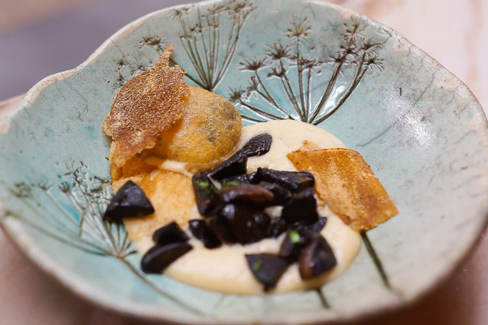 Weiter geht das Menü mit „Mushrooms & Horsehair Crab“, also Pilzen und der feinen Horsehair Krabbe. Kurz präsentiert wandert sie zurück in die Küche und kommt wenig später auf einem überraschenden Teller mit einer dunklen Soße zurück.
