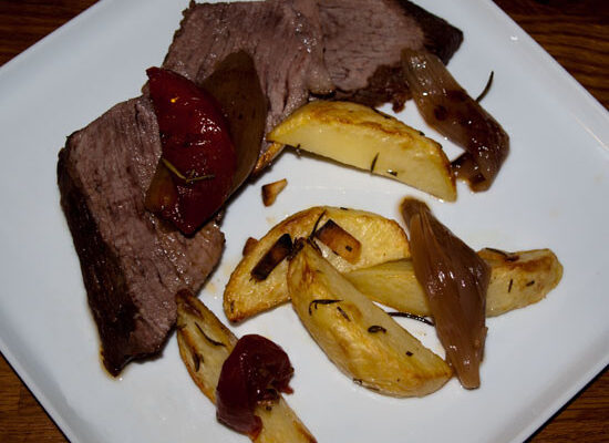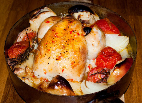 Hühnchenpfanne vom Bio – Huhn mit Apfelspalten – Gemüsezwiebeln und Tomaten