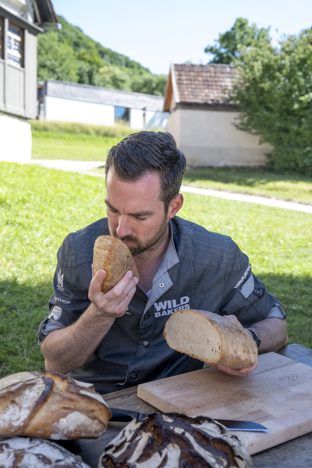 Die Tussi- und Machostangen sind als Erstes alle. Nicht nur, weil sie durch ihre rosa und schwarze Farbe besonders auffällig sind, sondern auch weil sie mit ihren Chia-Leindotter-Basilikumsamen und dem Holzkohle-Salz-Knoblauch-Topping besonders gut schmecken. Auch Jörg probiert seine Brote konzentriert. Er riecht daran, fühlt und kaut lange – alles mit geschlossenen Augen. Auch nach zwanzig Jahren als Bäcker und sieben als Brotsommelier empfindet er Brot immer noch als etwas Besonderes. Und er teilt sein Wissen gerne. Er verrät etwa, wie das schwarze Wurzelteigbrot (Machostange) und das rosafarbene Dinkelbaguette (Tussibrot) zu ihren Farben kommen: durch das Beimischen von Sepia und Rote-Bete-Saft. Vor allem beim Rote-Bete-Saft müsse man jedoch vorher entscheiden, wie das Endprodukt aussehen solle, verrät Schmid. Soll es auch innen rosafarben sein, müsse man das Brot sofort backen. Ließe man die vorgeformten Teiglinge über Nacht stehen, würden sie durch die Fermentation nur außen rosafarben sein.