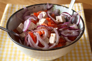 Rezept: Tomatensalat mit Tofu und roten Zwiebeln Tomatensalat mit Tofu und roten Zwiebeln ist ein leichtes und sehr gesundes Rezept mit Zutaten für jeden Tag und in weniger als 15 Minuten zuberei...