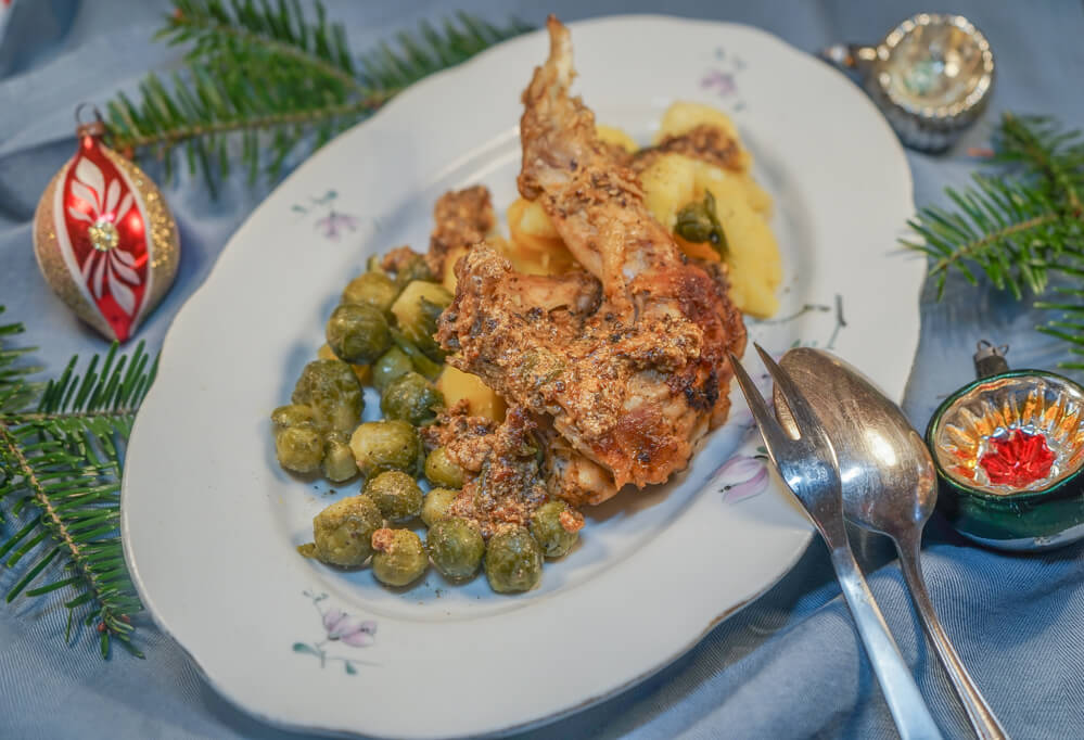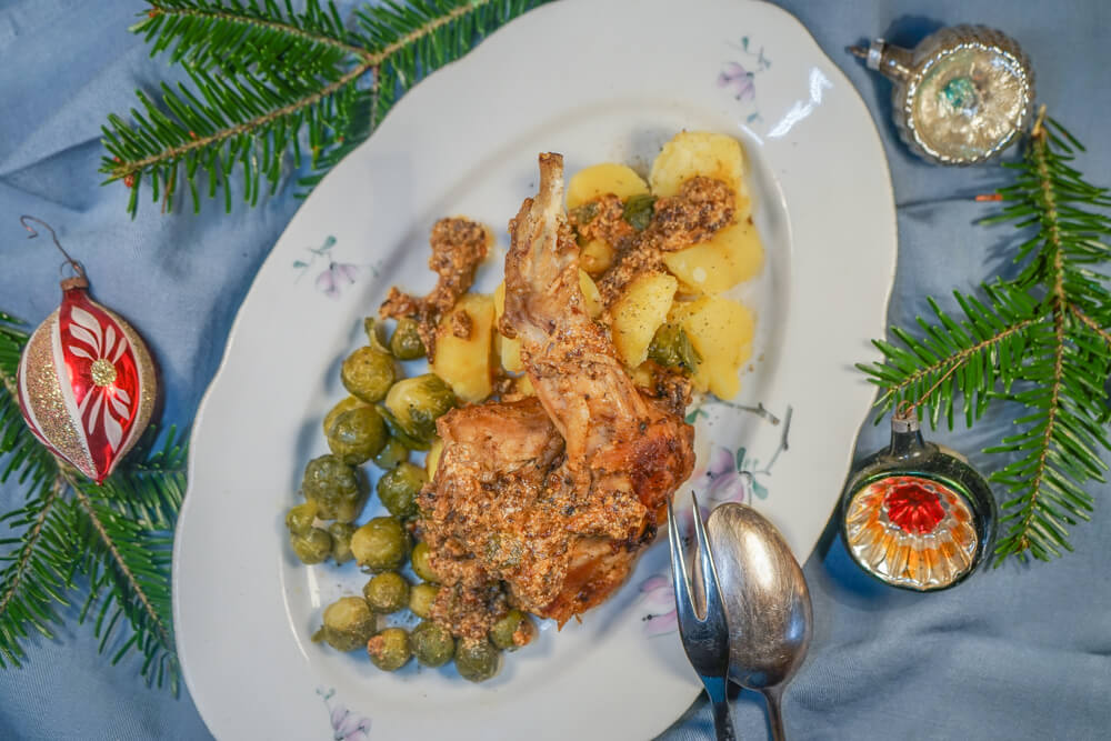 Geschmorte Kaninchenkeule mit Rosenkohl und Kartoffeln: Die Winterzeit und ein erneuter Lockdown hat Deutschland erreicht, quasi zwei Dinge die sich nur mit feinem Essen gesund und seelisch munter überbrücken lassen. Zum Glück sind die Märkte noch offen geblieben und so bleibt die Möglichkeit feines Wildfleisch, Ente und Gans aber auch frisch geschlachtetes Kaninchen vom Wochenmarkt zu erwerben. Gerade im Winter sind diese gut verfügbar und müssen nicht tiefgefroren gekauft werden.