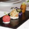Nun geht es zum Menü: Der erste Gang als Einstimmung ist eine Finger-Food Platte mit vier Solitären, die farblich schon einmal ordentlich Eindruck machen. Im einzelnen verspeisen wir mit Freude: 1. Guacamole Röllchen, Filo Teig, 2. Kartoffel Salat modern interpretiert, 3. Lachs Tatar, Krabben Brot, 4. Rote Beete Macaron, sous vide gegarte Apfel Creme, Rauch-Forellen-Mus.